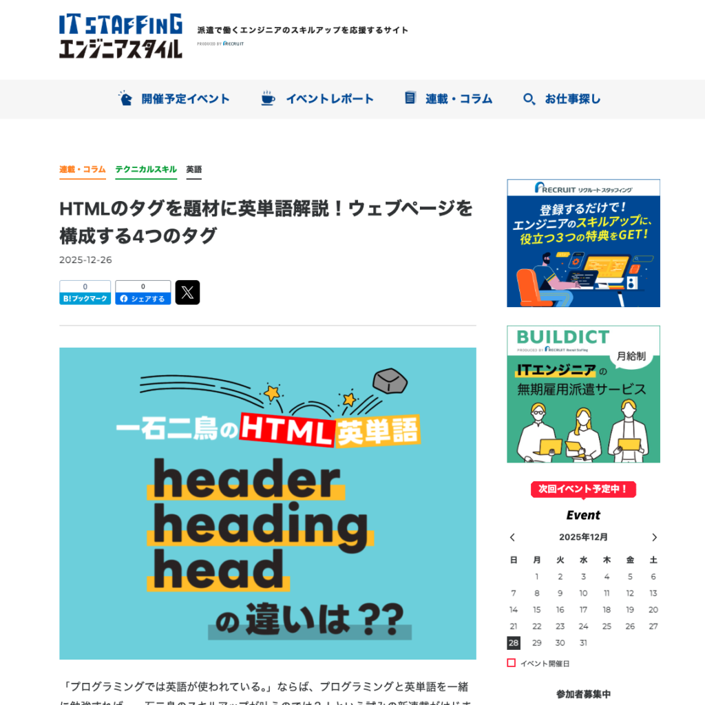 リクルートスタッフィングのオンラインマガジン「itstaffing エンジニアスタイル」に、連載「一石二鳥のHTML英単語」の第1回記事が掲載されました。
